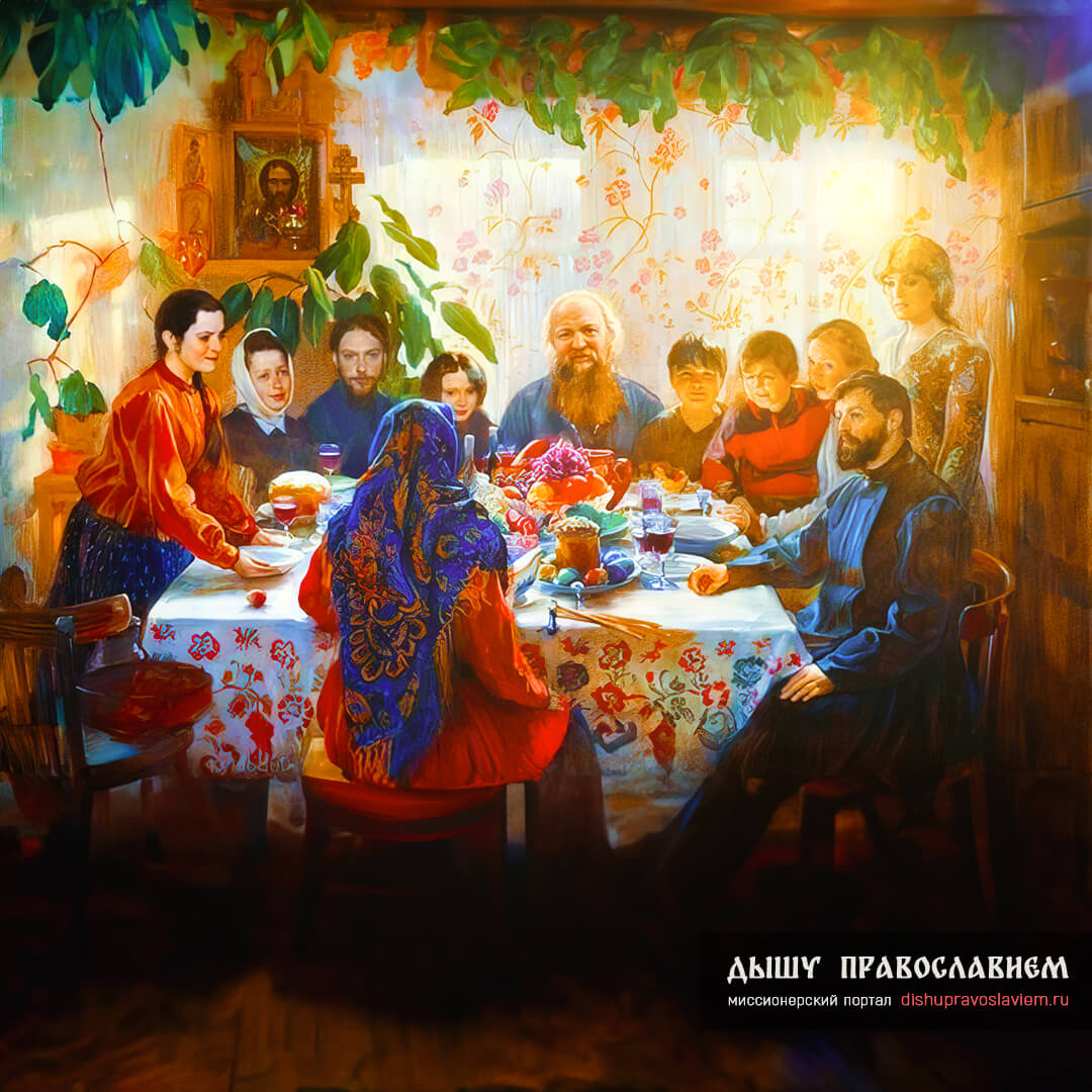 Дальше, обычно, гостя ждал накрытый стол. И это становилось главной проверкой. Здесь христианина подстерегала главная опасность – празднословие, осуждение и сплетни. Старинные руководства, вроде «Домостроя», были беспощадны к этому и учили принимать гостей так: «…ни яствы, ни пития для, а добрыя ради беседы… Дурных, пересмешных и блудных речей не слушати и не беседовати о том… Не пересмехатися и ни о ком и не переговаривати, и спросят о чем, про кого иногда и учнут пытати — отвещати: не ведаю, аз ничего того и не слыхал и не знаю». (Сильвесторовский Домостой, глава 34). Обратите внимание: люди собирались не ради угощения и бутылки, а ради доброй беседы. И если разговор скатывался на шутки ниже пояса, обсуждение гусарских похождений или начинались осуждения и сплетни, то лучшим ответом было вежливое, но твердое пресечение таких разговоров: «не ведаю аз ничего того и не слыхал и не знаю». Потому что такие беседы оскорбляли благодать, которая была призвана словами «Мир дому сему!». (Сравните это с тем, как проходят наши встречи и разговоры…)